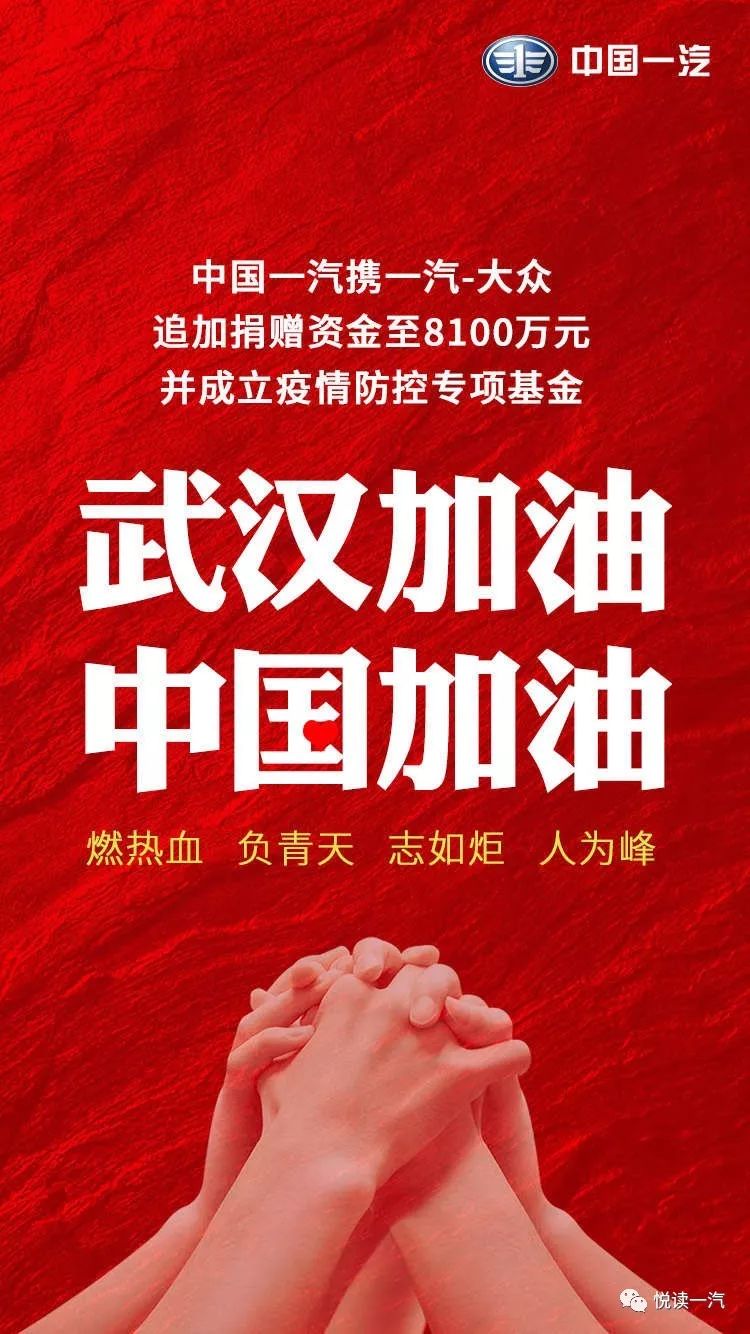 2月1日,经中国一汽党委常委会研究并正式宣布,中国一汽携一汽-大众追加捐赠资金至8100万元,并成立疫情防控专项基金,坚决助力打赢这场疫情阻击战。中国一汽及一汽-大众累计捐款均达到4000万元。