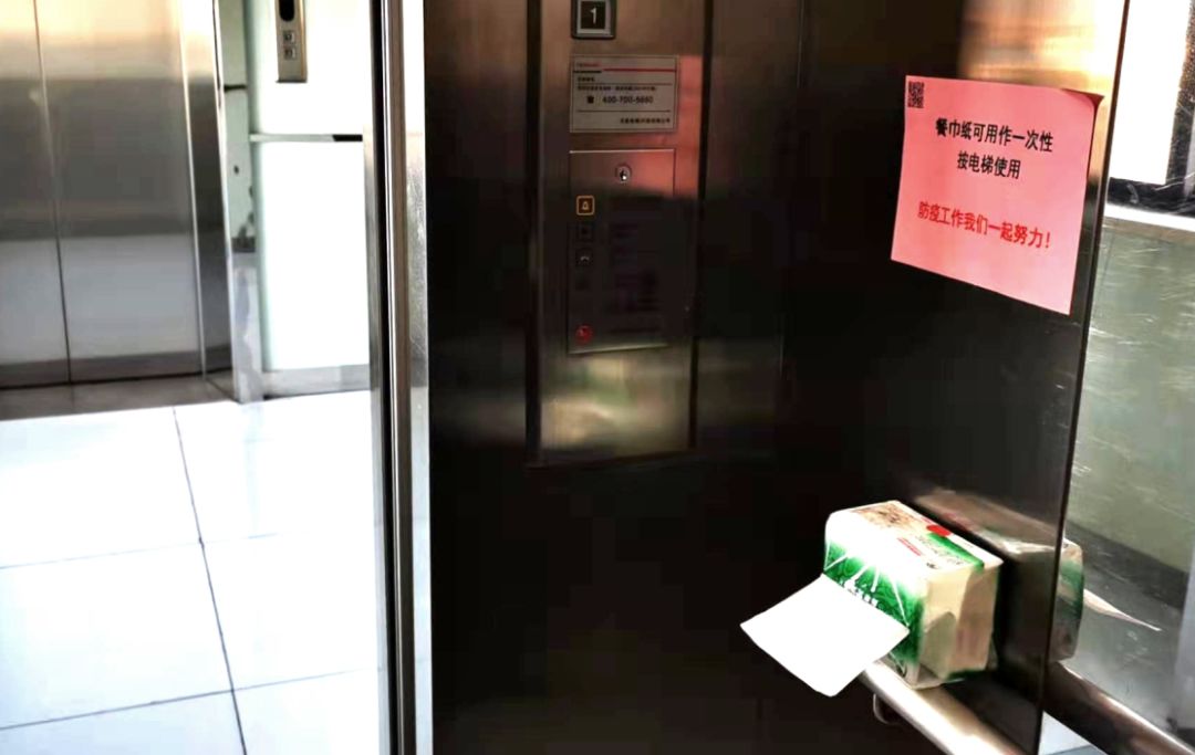 疫情防控小组时时关切员工们的安康,不定期在园区及员工宿舍发放疫情防控宣传资料、口罩、防护服、消毒水、酒精等物资。此外,天能还在电梯口准备了纸巾供按电梯使用。
