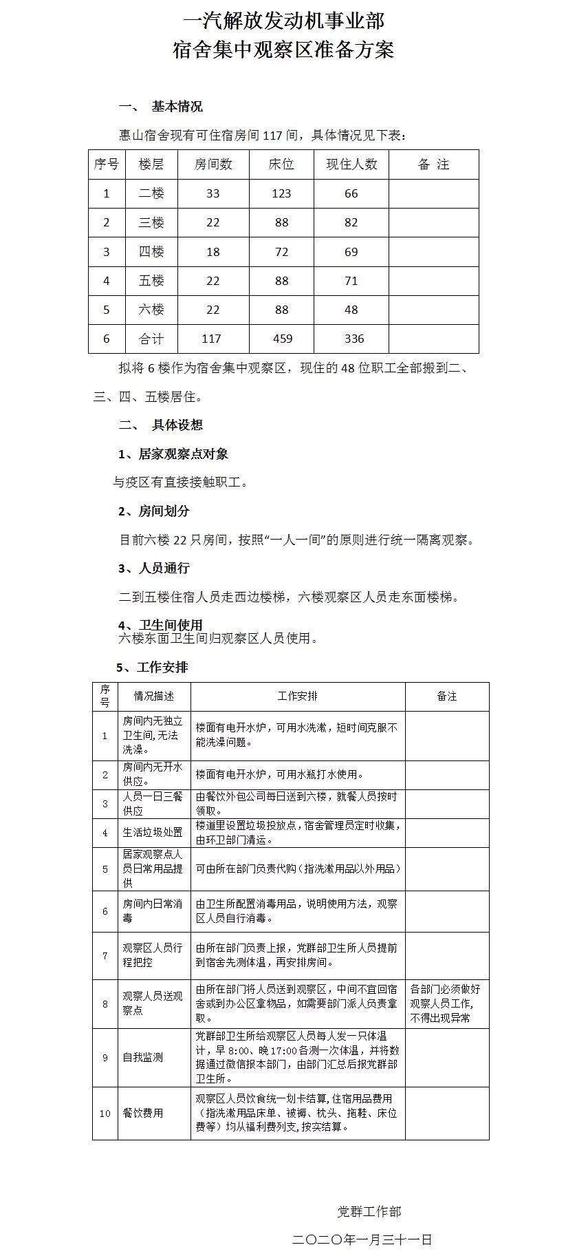 《一汽解放发动机事业部宿舍集中观察区准备方案》