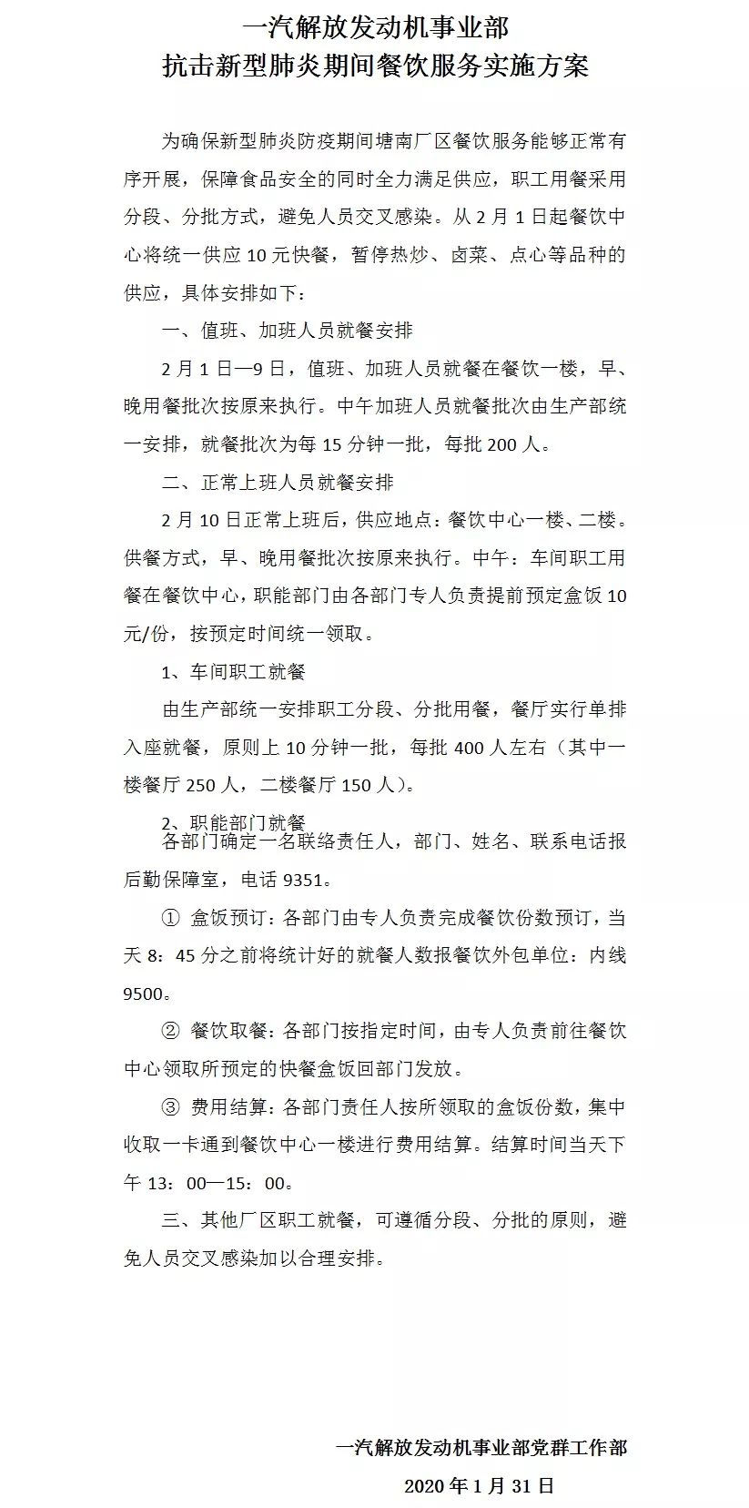 《一汽解放发动机事业部抗击新型肺炎期间餐饮服务实施方案》