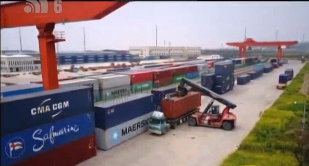 在央视《新闻联播》的这则新闻里,我们可以看到杭叉的45吨正面吊正在进行集装箱作业,把货物整齐有序地运到列车上。