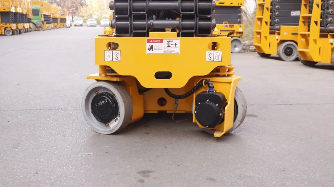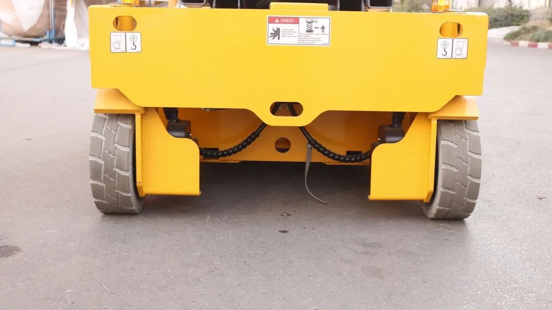 四轮驱动、两轮转向、车桥平衡、实心轮胎。车桥平衡系统可大幅提升车辆通过崎岖路面的能力;马达与减速机一体化的内藏式行走减速机,设有快慢速两档行驶速度,满足车辆在不同环境下行驶要求;在坡道行驶时,行走机构具有自制动功能,同时设离合装置,在出现故障时方便拖行。