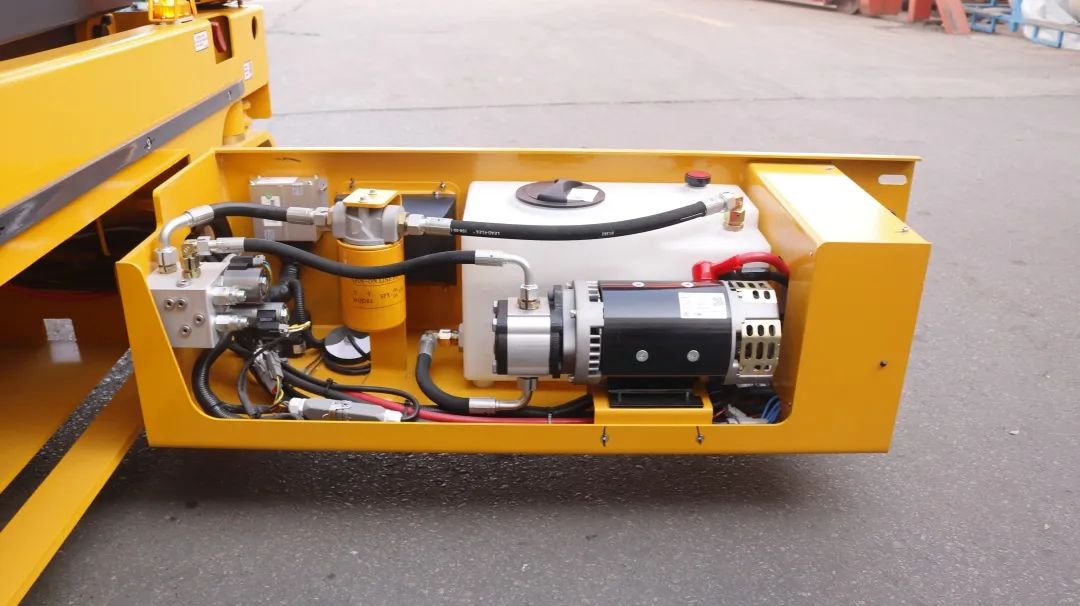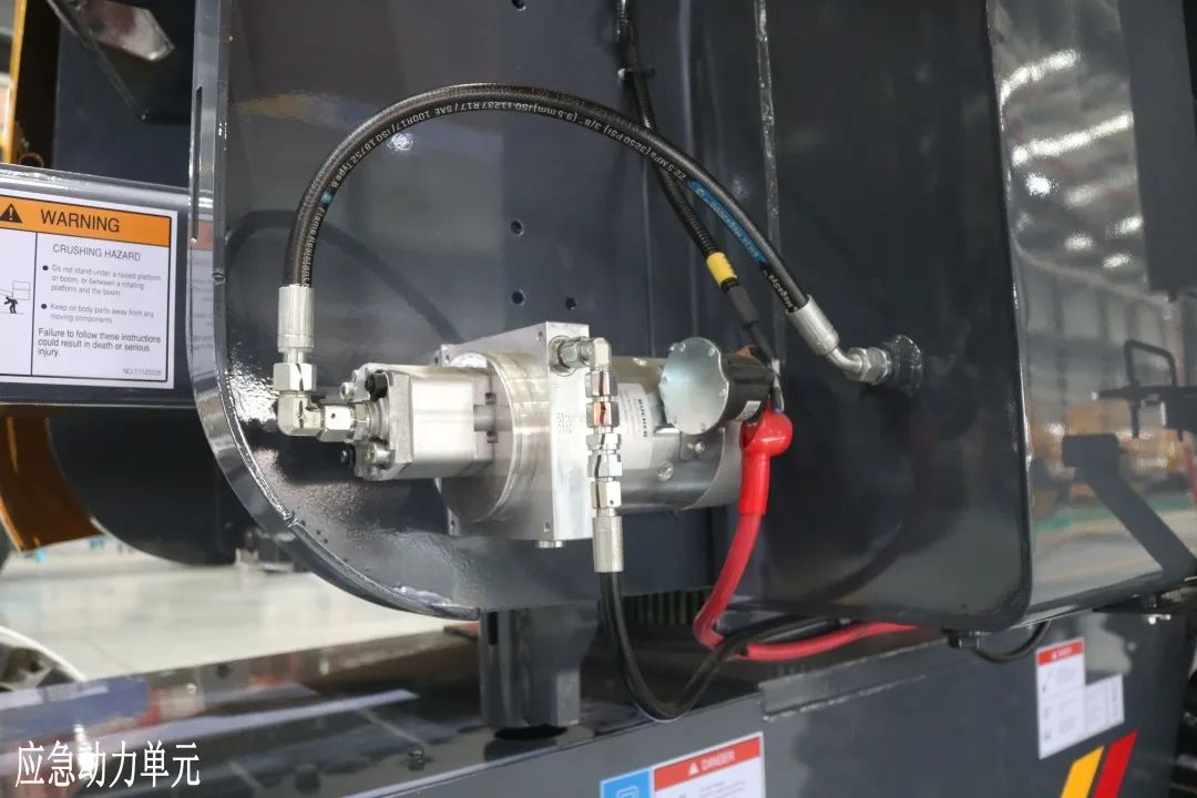 闭式泵+定量齿轮泵形式,由发动机直接驱动,为液压系统提供动力;上车液压系统为定量齿轮泵系统,主要动作采用电液比例控制技术,可实现上车回转、臂架变幅、臂架伸缩以及工作平台摆动等功能;下车行走为闭式变量系统,4×4驱动型式,行走分为高低两档,可实现车桥平衡、转向等功能;配置应急动力单元,保证发动机或油泵故障时能收回臂架至行驶状态。