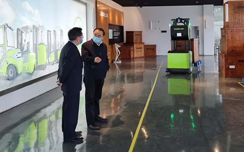 何书记听取了胡总关于公司疫情防控和安全生产的工作汇报,并深入生产一线,查看了新能源锂电叉车生产情况,随后现场参观了AGV工作演示。