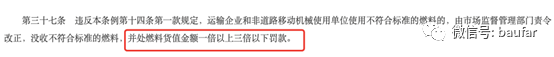 使用企业:第三十七条 违反本条例第十四条第一款规定,运输企业和非道路移动机械使用单位使用不符合标准的燃料的,由市场监督管理部门责令改正,没收不符合标准的燃料,并处燃料货值金额一倍以上三倍以下罚款。