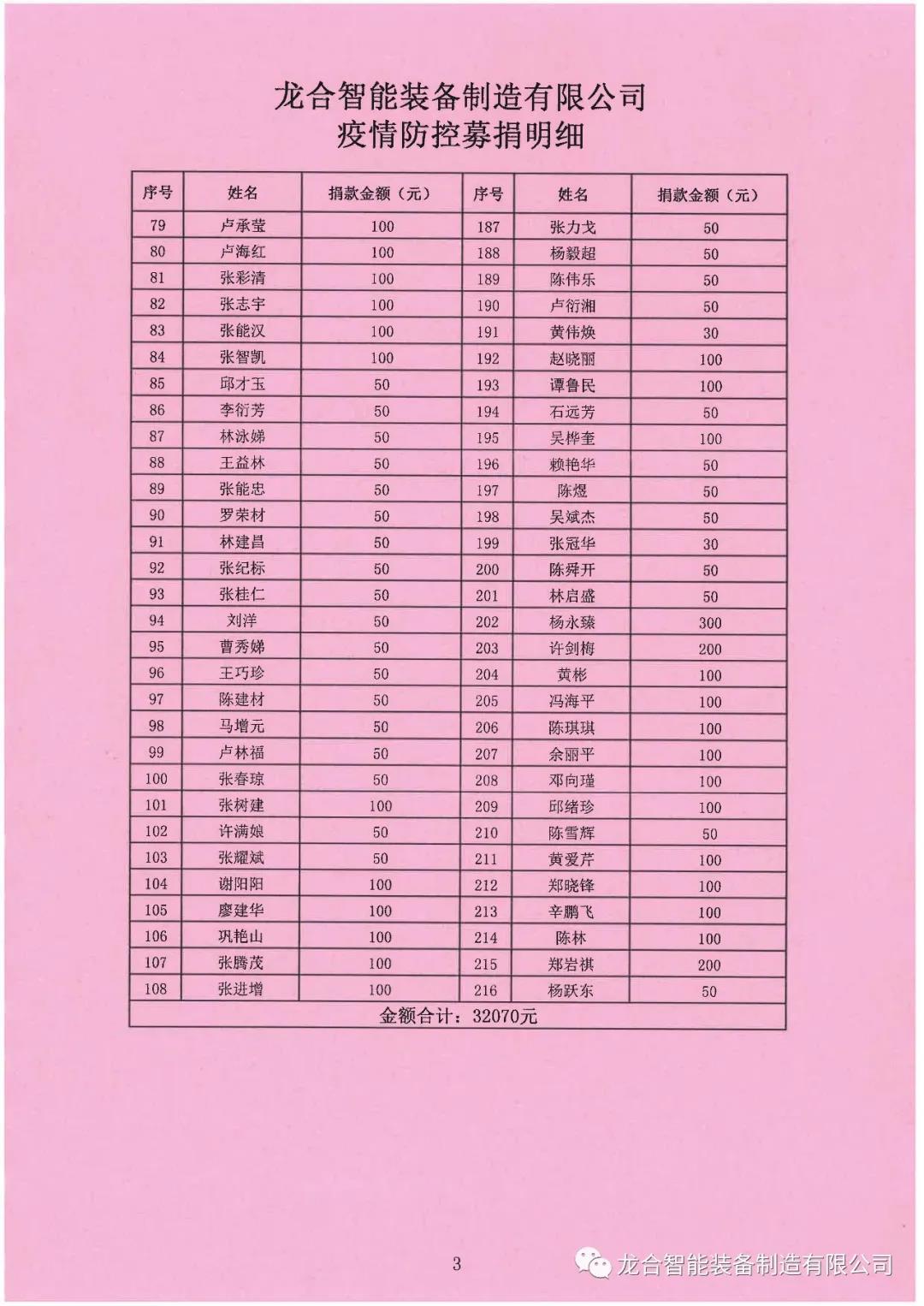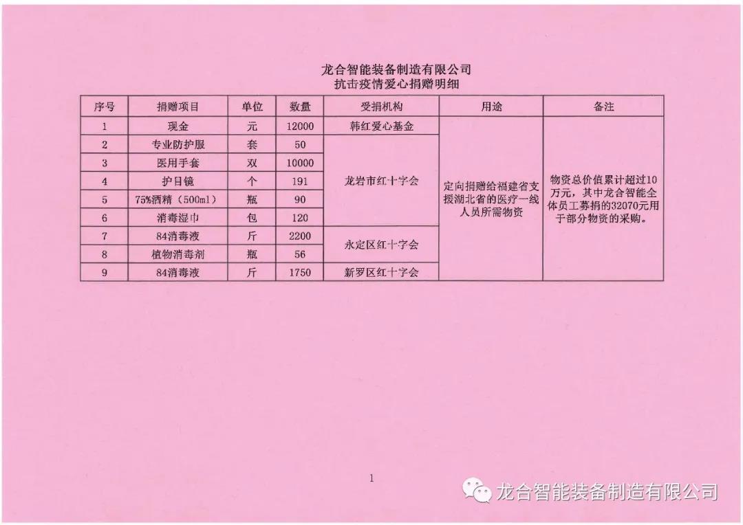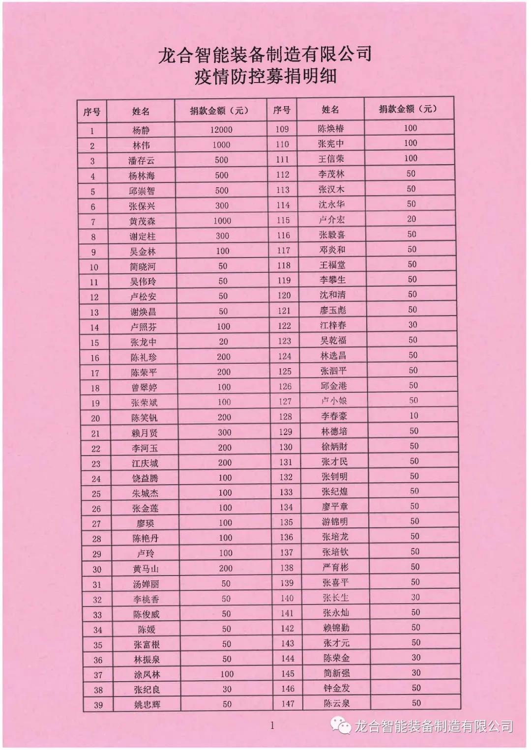 疫情无情人有情,爱心捐赠暖人心。为坚决打赢疫情防控阻击战,龙合智能党支部联合公司工会发出了募捐倡议,公司全体员工积极响应,奉献爱心,共筹集善款合计32070元,全部用于购买防疫物资。为让全体员工捐赠的每一分钱都发挥最大的价值,同时接受全体员工的监督,现将捐赠明细、受赠方及捐赠用途公示如下: