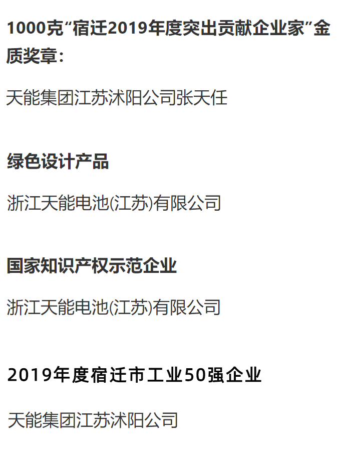 沭阳公司依托天能集团的雄厚实力以及产学研平台,不断提高自主创新能力,加快绿色智造推动企业高质量发展的步伐。在3月17日召开的宿迁市加快工业经济高质量发展暨招商引资大会上,沭阳公司还捧回全国绿色设计产品、国家知识产权示范企业、宿迁市工业50强企业、宿迁突出贡献企业家等荣誉称号。