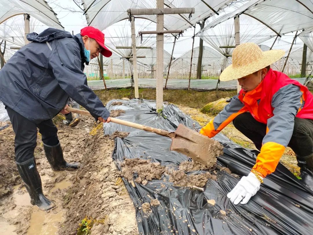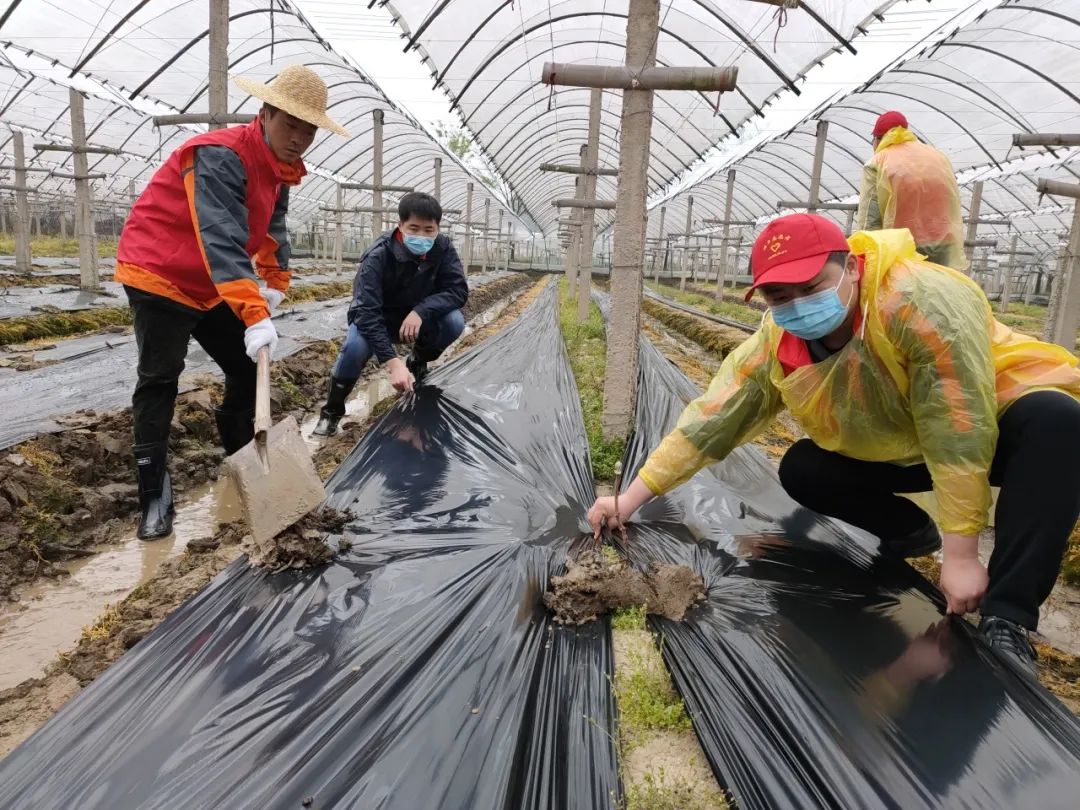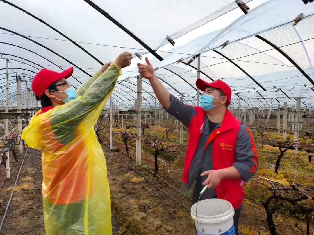 在现场,志愿者们顾不得泥泞的田洼地就开始干活了。这些志愿者中有厂区厂长、车间主任、机械工程师、平面设计师等,平时他们都在各自的工作领域得心应手、游刃有余,想不到下到田间地头开展农事活动那也是一把好手。大家配合默契,不一会儿就铺好了几条田垄的除草薄膜。通过一上午的努力,十余座“通天”的大棚也被铺上了透明塑料膜,保证了棚下的葡萄苗不受风吹日晒、降温降雨和病虫害的威胁。