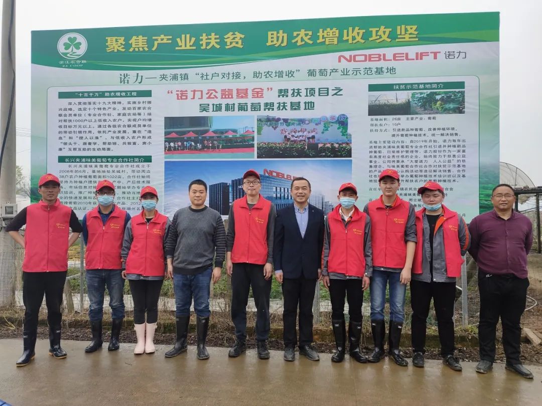 2019年底,诺力公司通过“诺力公益基金”定向资助了吴城村葡萄帮扶基地,首批资金10万元已到位。项目旨在和当地政府部门一起帮助困难农户购买葡萄新品种,引进种植新技术,维持日常管理等,为贫困农户增收增产提供有利条件。