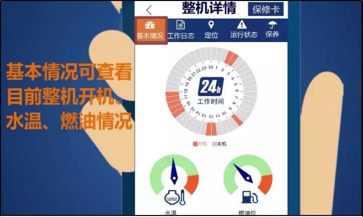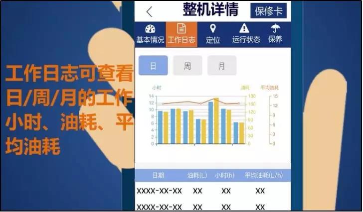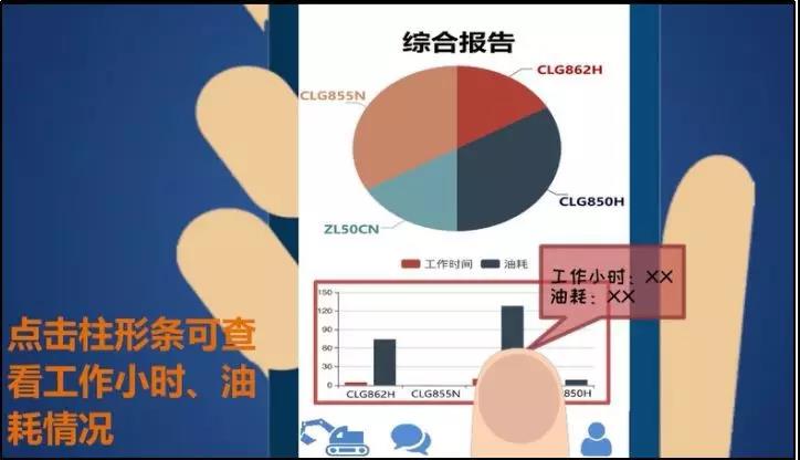 登陆成功后,立即出现一个综合报告界面视图,可查看车队各机型的油耗、工作小时等信息。点击下方“车队”按钮,可选择具体查看某台车辆的当前工作小时、当日油耗、保养时间、定位、报警记录等工作状况。