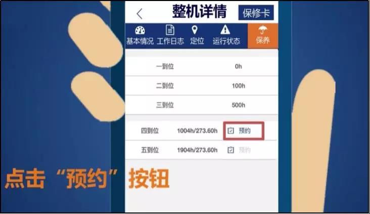 ”按钮,按机型、机号进行精确查找),点击设备图标,进入到整机详情界面,点击右上角“保养”选项卡,选择本次应做到位保养,点击“预约”按钮,进入填写预约单界面。