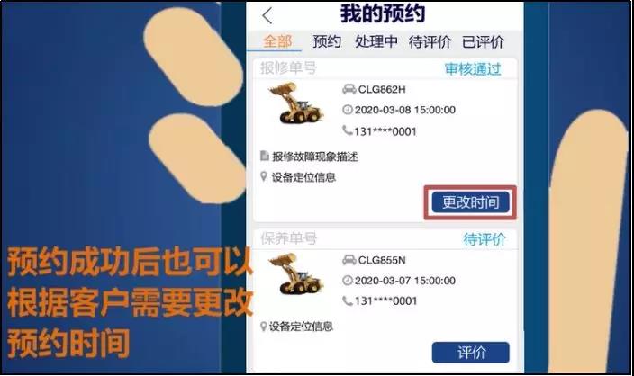 预约单的联系信息自动填入当前设备的关联信息,客户可根据实际情况手动输入,确认好联系信息及选择上门服务时间后,点击提交即可完成预约保养,柳工服务工程师将在您的指定时间上门提供服务!在提交预约后,如遇特殊情况需要更改时间还可以在APP上更改预约时间。