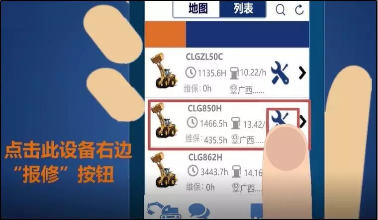 在车队列表里,找到您需要报修的设备,点击设备右侧扳手报修图标,进入到设备报修单填写界面。