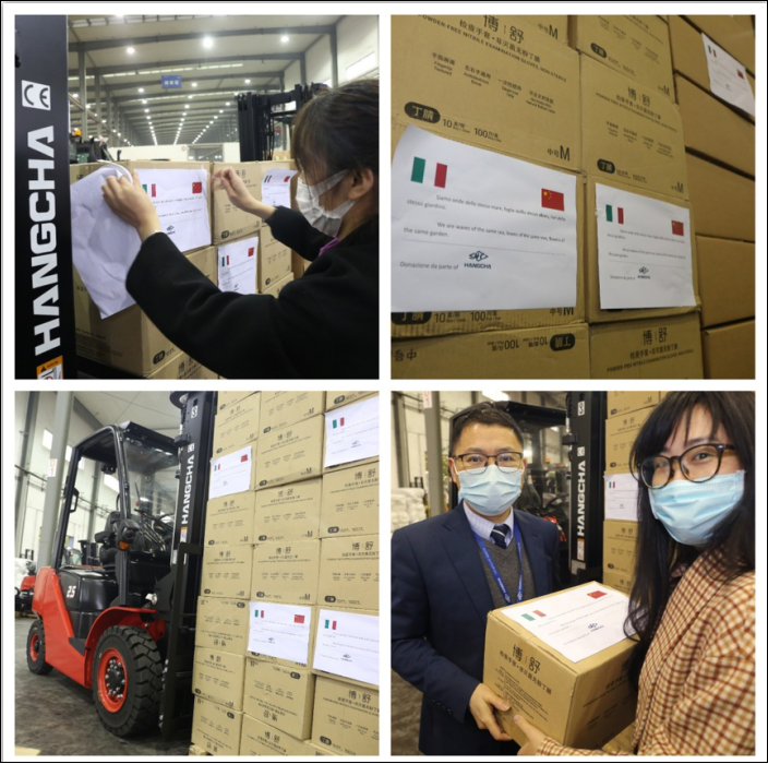 同时,杭叉经过多方努力,紧急筹措了价值100万元的医疗防疫物资,包括一次性医用口罩100000只、一次性医用手套60000只、医用防护服2000套、面罩2000个等物资驰援意大利、德国、法国、西班牙、巴西、美国、韩国等全球50多个国家的80余个合作伙伴及医疗机构。在抗击疫情的关键时刻从对代理商无微不至的关怀与帮助到大力捐赠海外医疗机构,无不彰显了杭叉作为龙头企业的责任与担当。