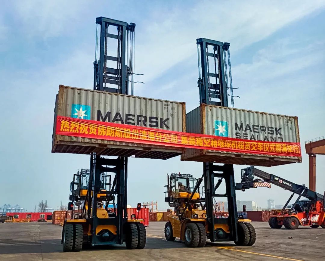 下午13时,简单而又不失郑重的交付仪式如期举行,在片区经理李雪的带领下、滨海分公司租赁服务人员的团队协作及辛勤努力下,本次的主角-集装箱空箱堆垛机终于顺利落地,完成交付。