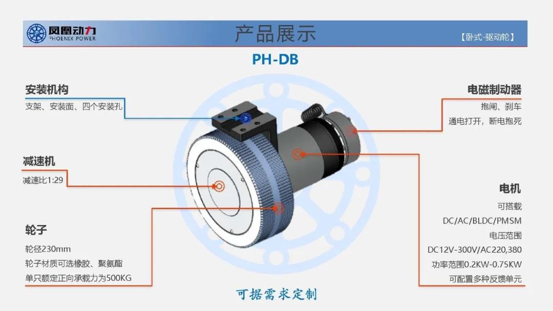 【自行走式高空作业平台车专用电驱动轮组】【PH-DB】系列电驱动轮总成包含驱动牵引电机及其速度反馈装置、减速箱体机构及轮体、安装机构、制动机构等,属于机电一体化高度集成的产品,通过适配PhoenixPower@Driver行业专用的一拖二驱动控制器,同时控制两台行走牵引驱动电机,可以精确控制驱动轮的速度、转矩、位置,支持脉冲、模拟量及CANopen/RS232/RS485/Modbus等多种总线控制方式,兼容多种反馈单元。