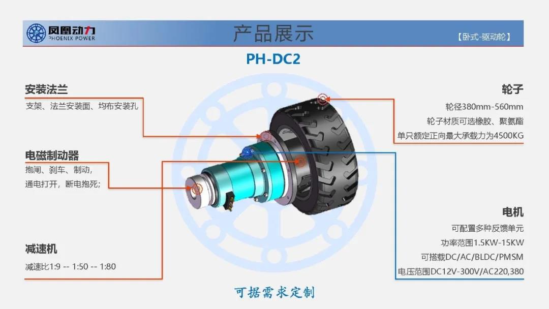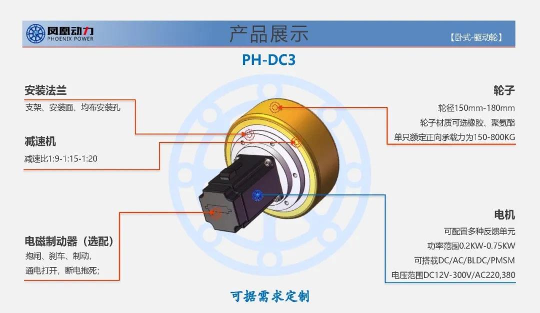 【PH-DC】系列适合于室外应用场景,具备较强的越障能力与爬坡能力,具备一定的涉水能力,适合室内外应用的电驱动移动设备和车辆,转动半径小,同时具有较大扭矩输出与驱动牵引力。