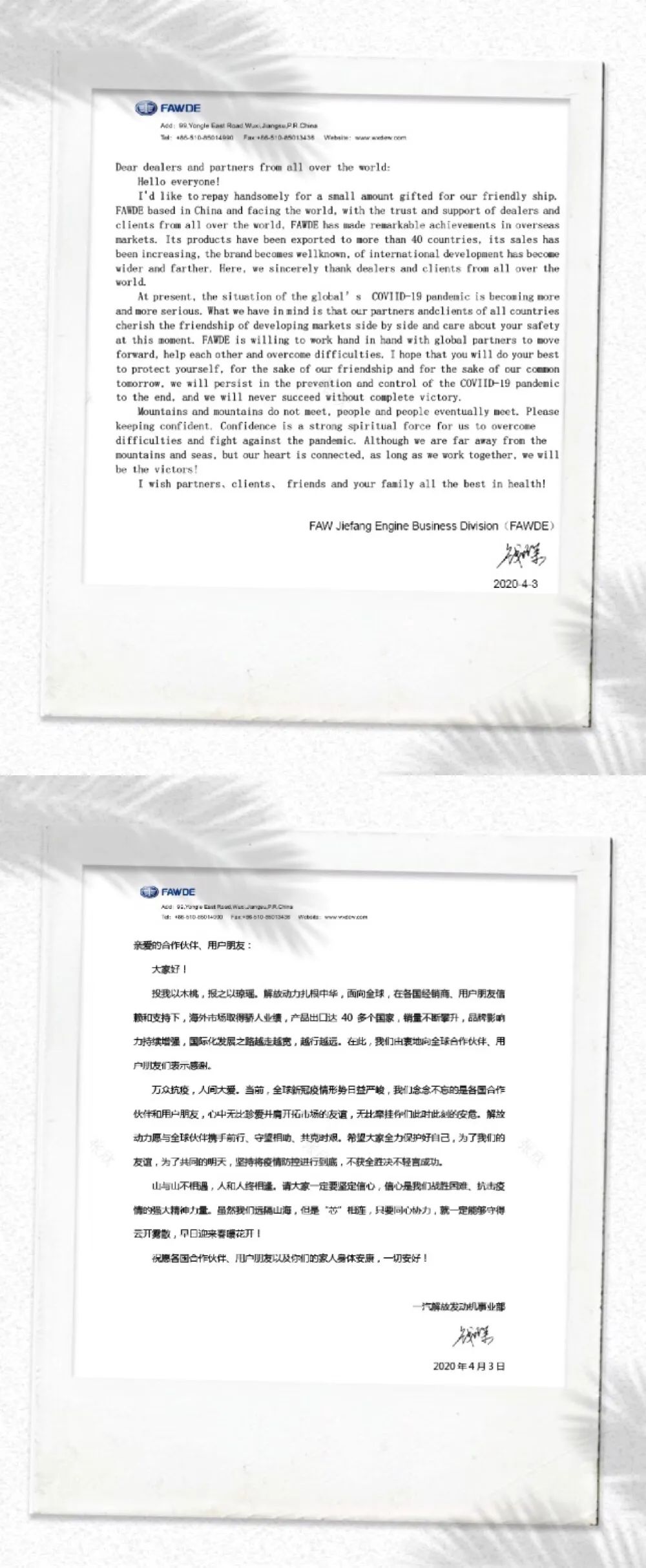 4月3日,一汽解放总经理助理,解放发动机事业部党委书记、总经理钱恒荣致信,感谢新冠肺炎疫情以来,海外合作伙伴对解放动力的支持和关心,并表达事业部与海外朋友的芯手相连之情。