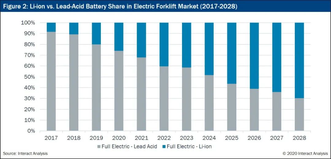 2019年,全球动力锂离子电池(用于电动汽车或建筑机械)的出货量约为120 GWh,其中磷酸铁锂电池约占28%。在电动乘用车市场,NMC 镍钴锰酸锂/ NCA镍钴铝酸锂电池具有绝对优势(市场份额超过90%);但在商用车应用中,磷酸铁锂占据主导地位。另外,电动叉车市场也不容忽视。我们最新的叉车报告显示,锂离子电池正在迅速取代传统的铅酸电池(见图2)。2019年,全球售出超过200,000台锂离子叉车。