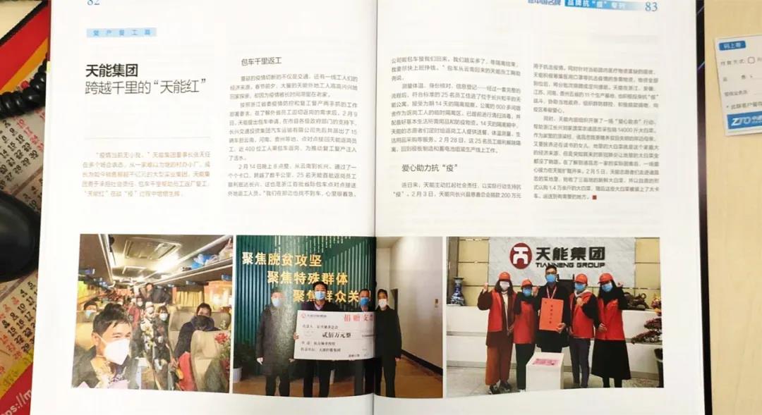 新华社民族品牌官方刊物《中国名牌》,在品牌战“疫”专刊中对天能防疫工作做了专题报道,并通过中国邮政、中国报刊发行局面向全国发行。这既是对天能防疫工作的肯定,也是鞭策,激励着天能在这场战“疫”总体战中,用责任与魄力承担起这漫长战线的一部分,为战“疫”的全面胜利做出贡献。