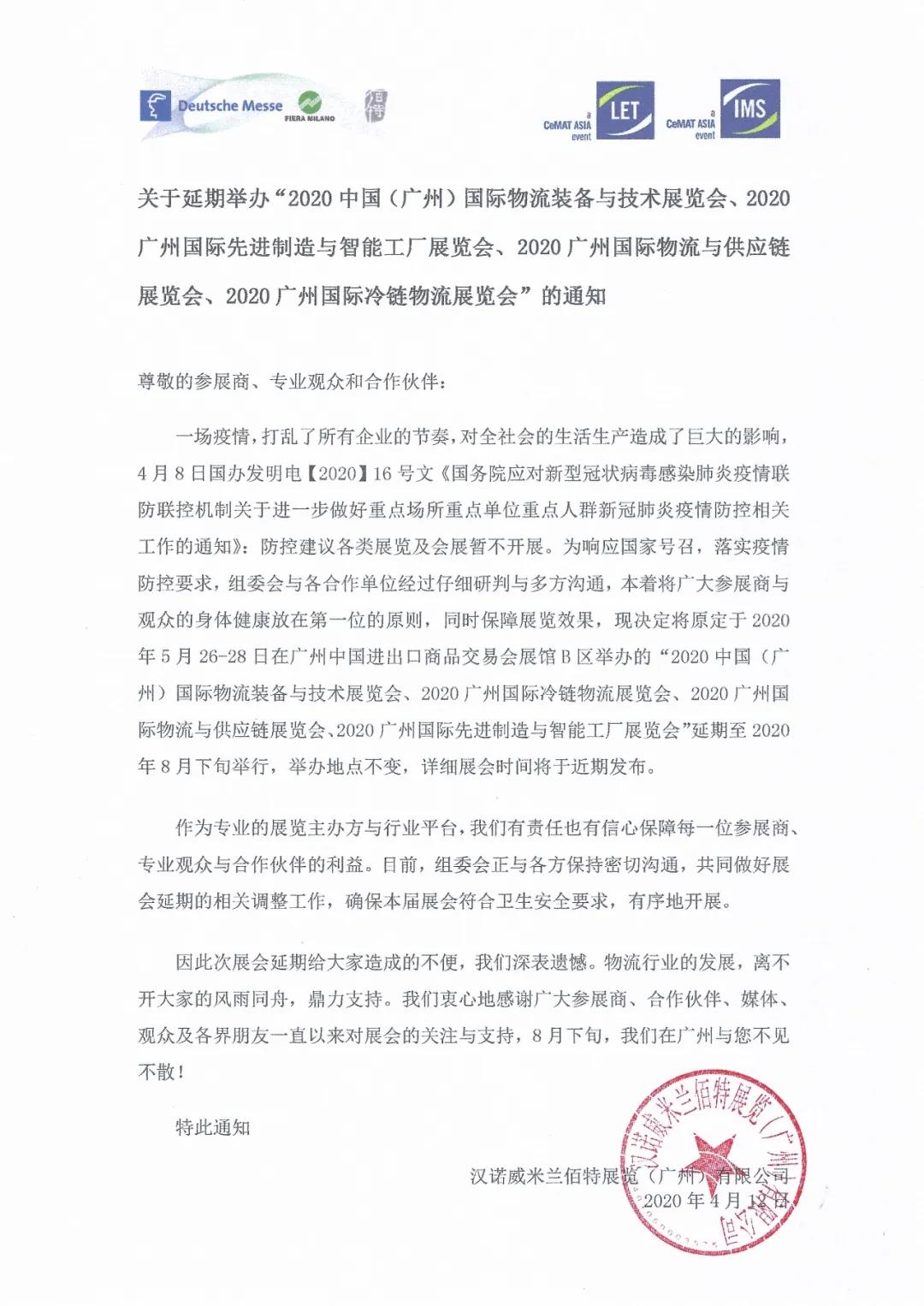 为响应国家号召,落实疫情防控要求,组委会与各合作单位经过仔细研判与多方沟通,本着将广大参展商与观众的身体健康放在第一位的原则,同时保障展览效果,现决定将原定于2020年5月26-28日在广州中国进出口商品交易会展馆B区举办的“2020中国(广州)国际物流装备与技术展览会、2020广州国际冷链物流展览会、2020广州国际物流与供应链展览会、2020广州国际先进制造与智能工厂展览会”延期至2020年8月下旬举行,举办地点不变,详细展会时间将于近期发布。