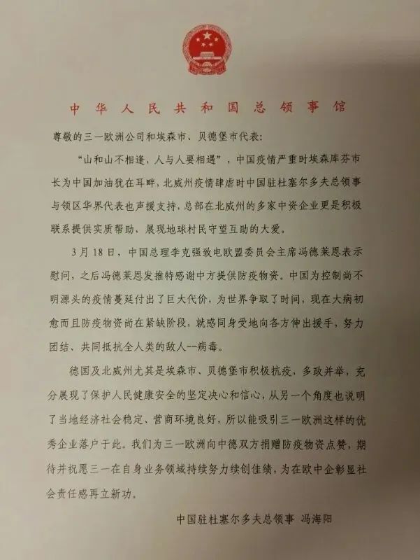 早在3月中,中国驻杜塞尔多夫总领事冯海阳也特意向三一欧洲发来信函。