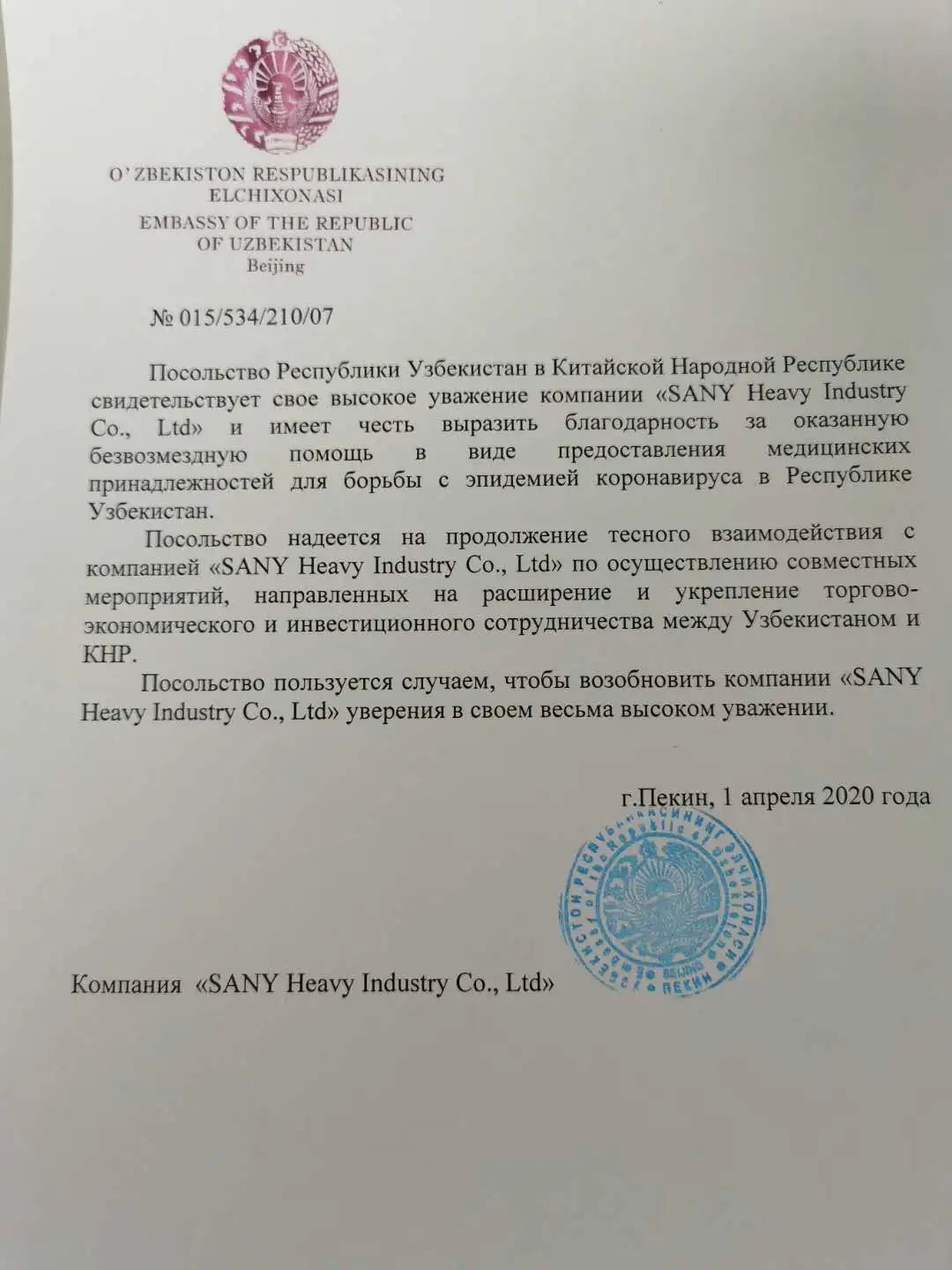 信中称,大使馆向三一重工致以崇高敬意,诚挚感谢三一重工向乌兹别克斯坦提供抗击病毒的医疗用品。