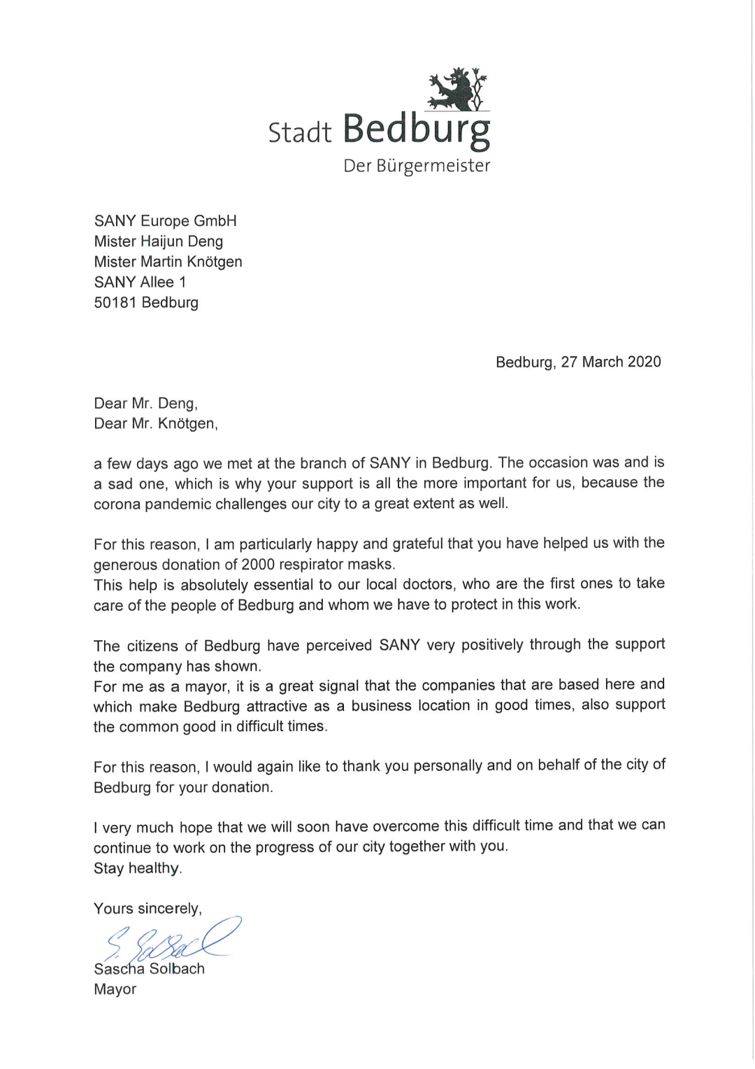 信中写道:三一是贝德堡的标志,不仅平时为当地吸引大量投资,在困难时期,其一如既往地提供帮助、表达善意。“贝德堡的市民,都对Sany给予了高度评价”。