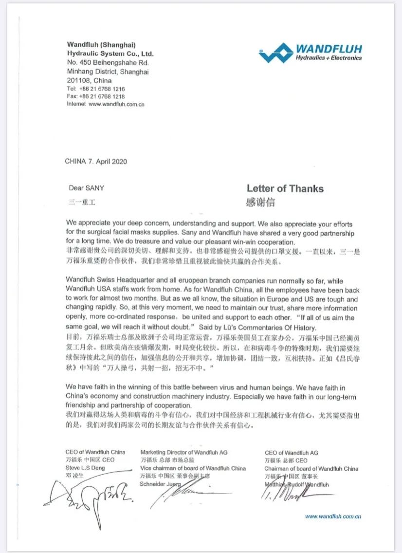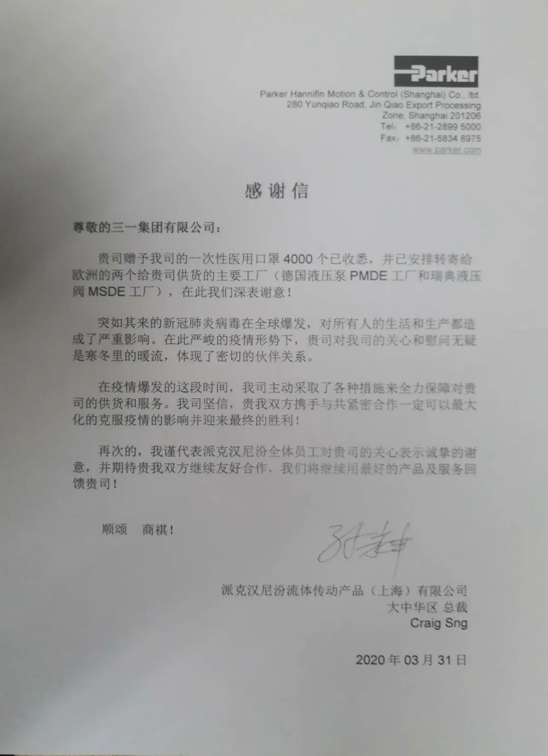 “在如此严峻的疫情情况下,贵司对我司的关心和慰问无疑是寒冬中的暖流,体现了密切的合作关系。”派克汉尼汾在信中如此写道。