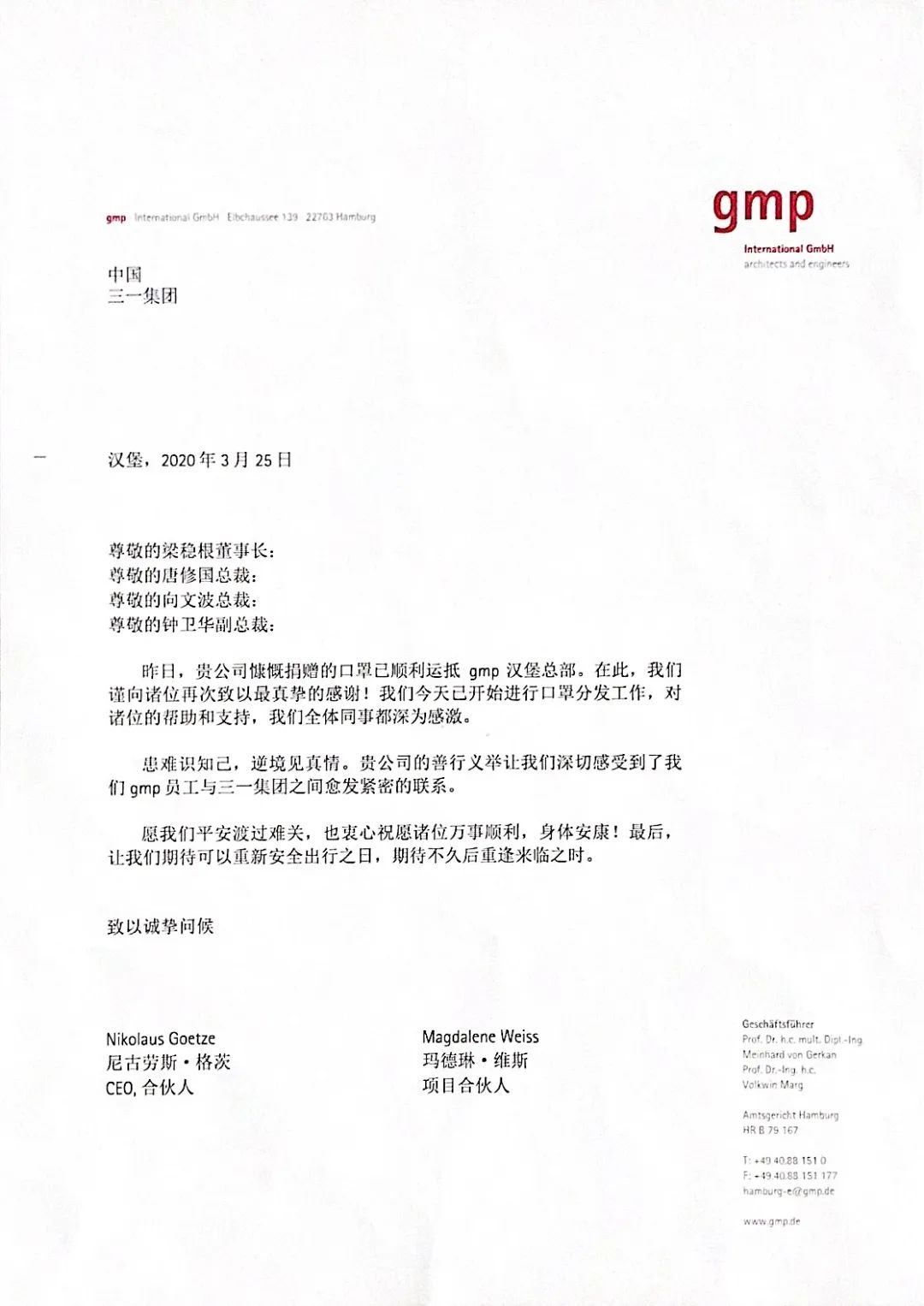 为感谢三一集团捐赠的1200个口罩,GMP建筑师事务所CEO尼古劳斯格茨,向三一集团发出的一封感谢信。