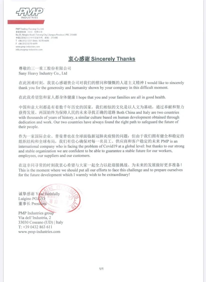普曼普传动在收到三一捐赠的口罩物资后,表示:“再次困难时刻,衷心感谢贵公司对我们的慰问和慷慨的人道主义精神。”