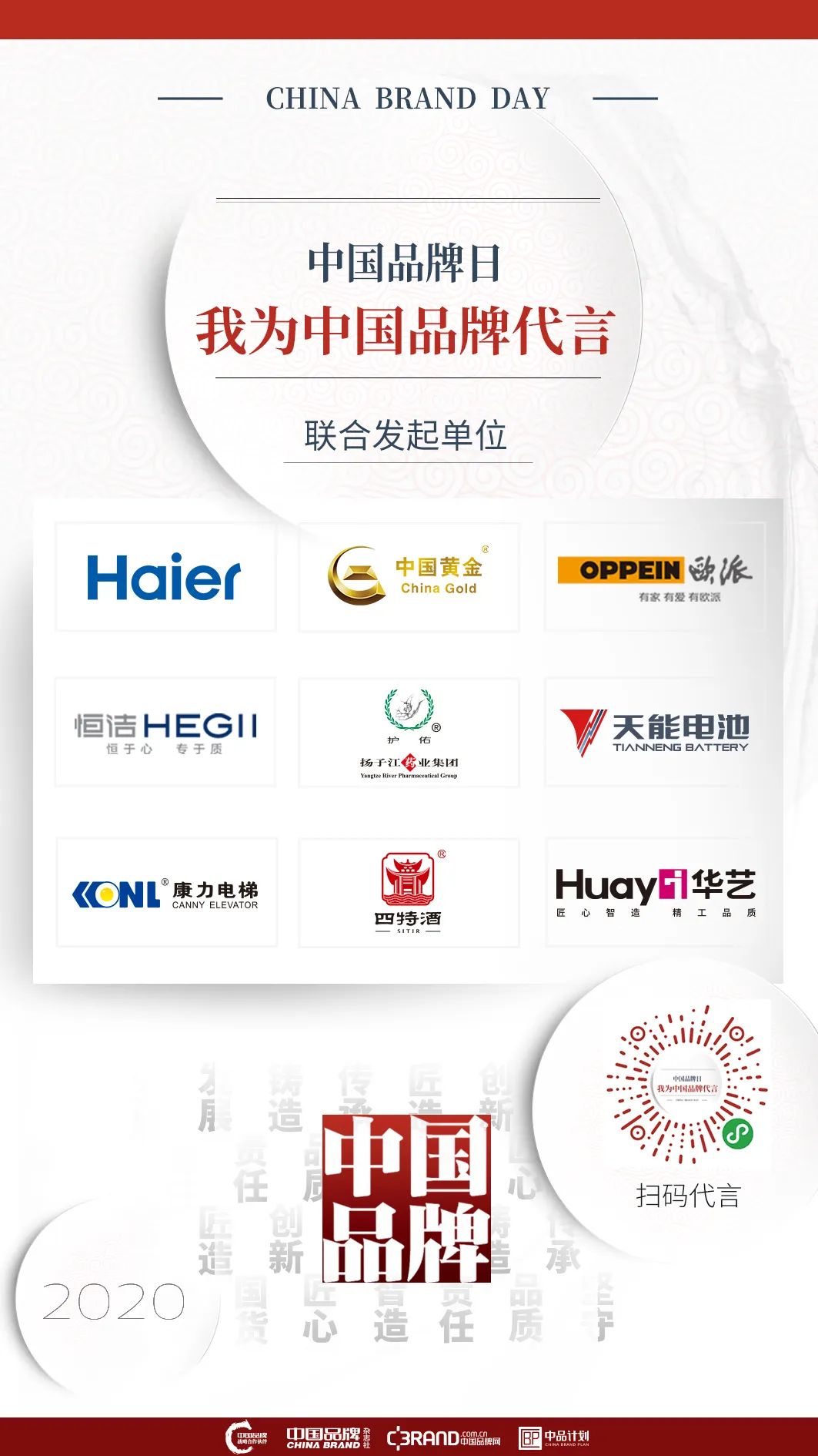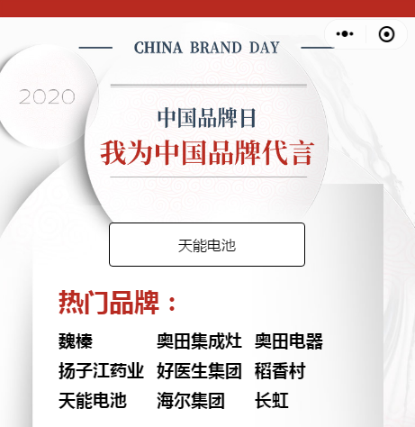 手机长按识别下方小程序,进入我为中国品牌代言活动,选取企业名称(如:天能电池),上传你的姓名和照片,生成专属海报,人人为中国品牌代言!