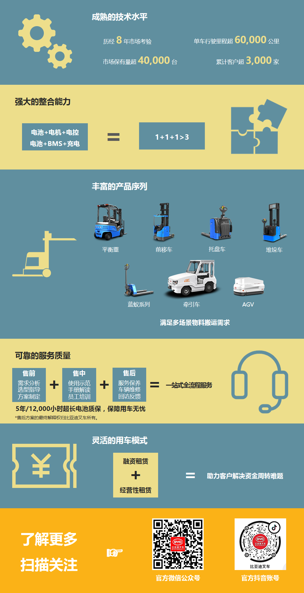 【服务宗旨】比亚迪叉车可按照不同客户的特殊需求设计符合客户要求的产品,产品设计灵活、多样。为了让比亚迪叉车可以更好的服务于客户,我们配备了专业的销售团队,为每一位客户提供专业的服务。“客户至上”是比亚迪叉车永久不变的服务宗旨。比亚迪遍布华北、华中、华东、华南和西部大区的售后服务网点和高素质的服务工程师队伍,保证了快速、高效的售后服务。