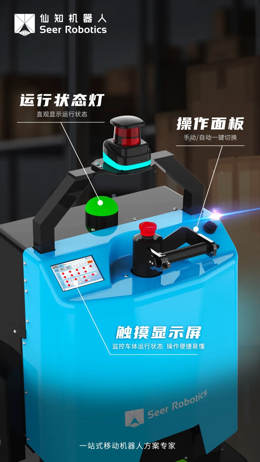 在基于SRC的小型搬运式叉车上,有触摸显示屏、急停按钮、运行状态灯及一键模式切换开关等,不仅能够直观显示自动叉车的电池电量、运行状态及业务信息,而且易于操作,简单易懂,无需专业的叉车司机,大大降低人力成本。