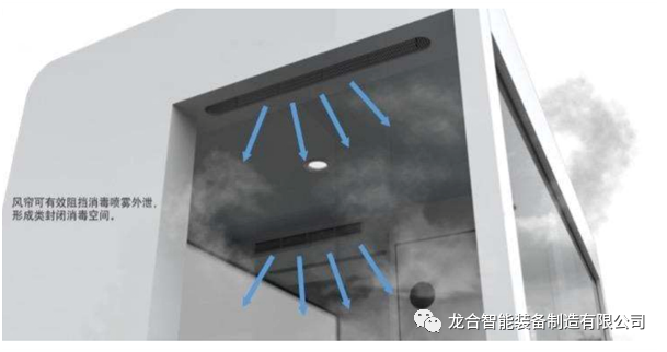 雾化消毒区设有风幕系统,前后两个气帘形成独立空间消毒箱体,使整个消毒区成为封闭消毒空间,人员进入箱体即可快速完成全方位沉浸式的消毒,且确保消毒气体不外泄。