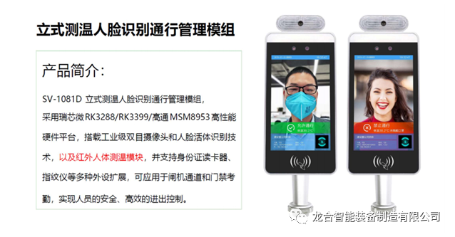 龙合智能防疫工作站配置了AI视觉智能检测系统,支持可见光和红外双目摄像头,支持活体检测及强逆光环境下人员运动人脸追踪曝光;独有的人脸识别算法,能精准、快速识别人脸,可检测温度30℃到45℃,检测精度±0.5℃;内置立式测温人脸识别通行管理模组,避免人员接触,规避传统指纹打开的传染风险。