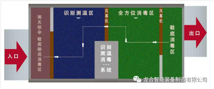 龙合智能防疫工作站分为鞋底清理区、识别测温区、全方位消毒区(雾化消毒区)、鞋底消毒区,四个区域可同时工作、连续通行,测温、消毒、考勤等一站式搞定。