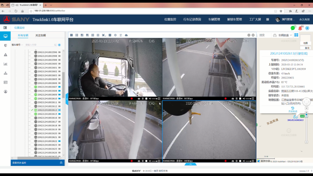 车联网平台的多个摄像头可实时对司机或操作手进行行为监控,对驾驶行为进行分析,精准描绘操作画像,一旦发现异常操作即可进行提示,保护驾驶员安全。