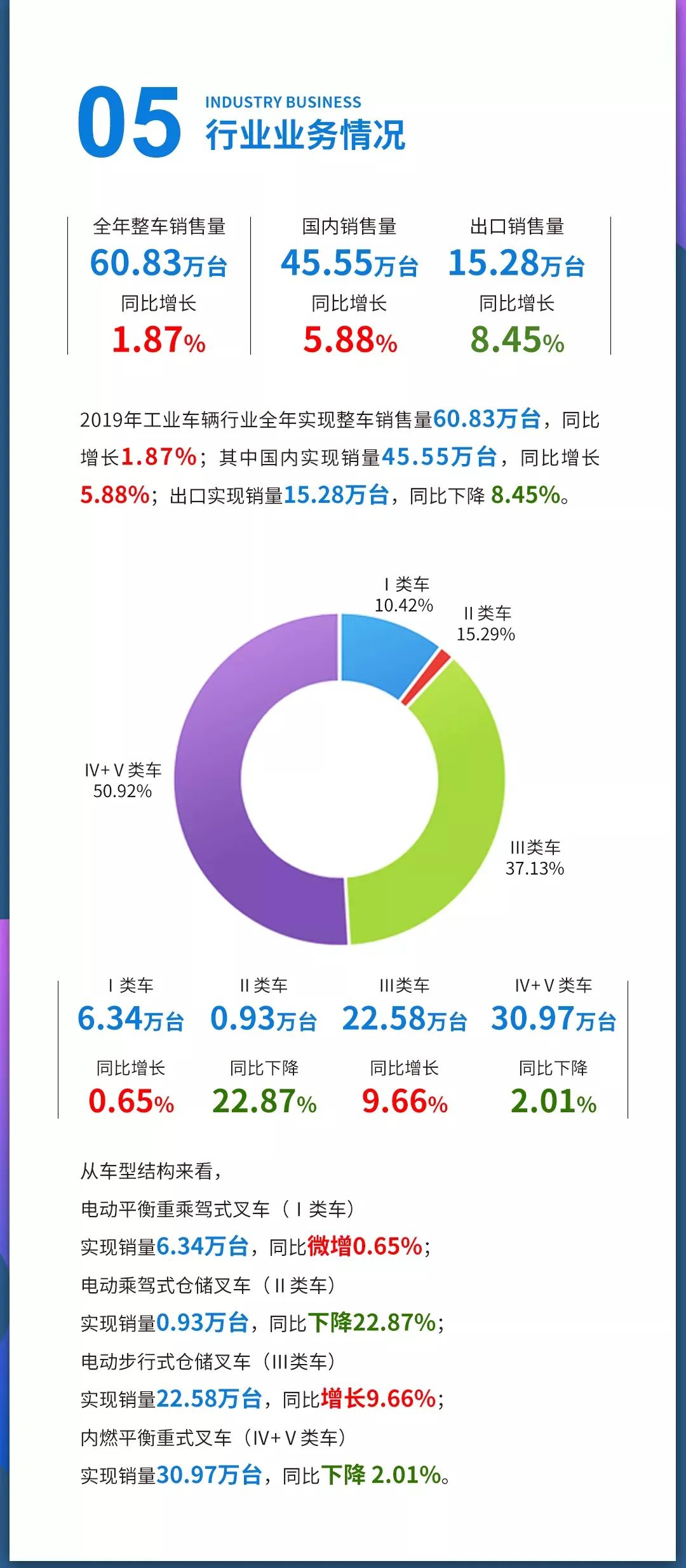 公司已形成1-48吨内燃叉车、0.75-18吨蓄电池叉车、集装箱专用叉车、45吨集装箱正面吊、牵引车、搬运车、堆高车、越野叉车、伸缩臂叉车、登高车等全系列、多品种的产品结构以及多款AGV智能工业车辆,达上万种品种规格。自主开发的新产品多次荣获全国机械工业大奖,省、市科技进步奖,并获全国用户满意产品称号,主导产品获国家出口免验资格。