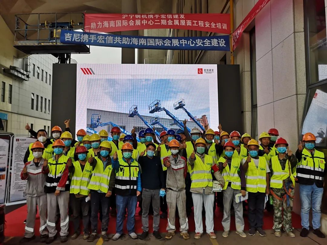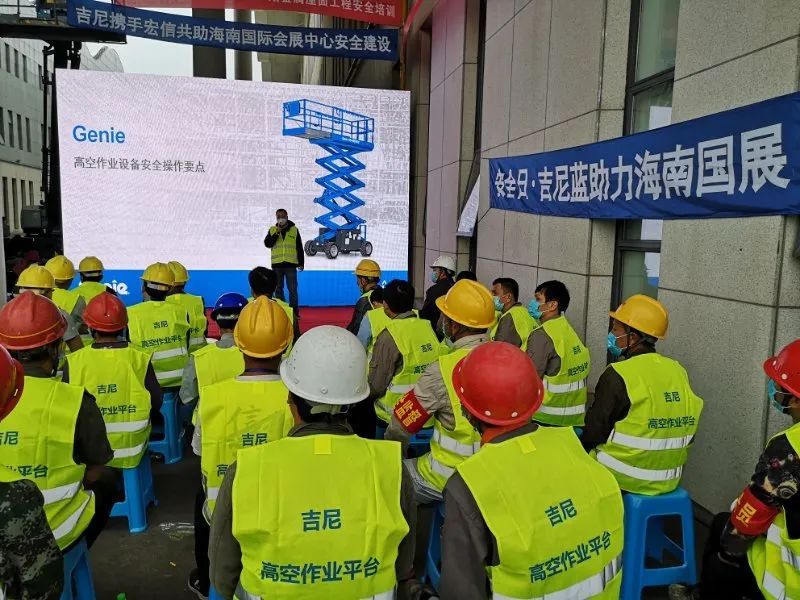 4月24日,吉尼携手宏信建发在海南会展中心二期举办了安全日活动, 组织现场设备操作工及安全管理部门人员详细讲解了高空车安全操作规范、违规操作演示和故障排查方法,并进行了设备安全操作演示。