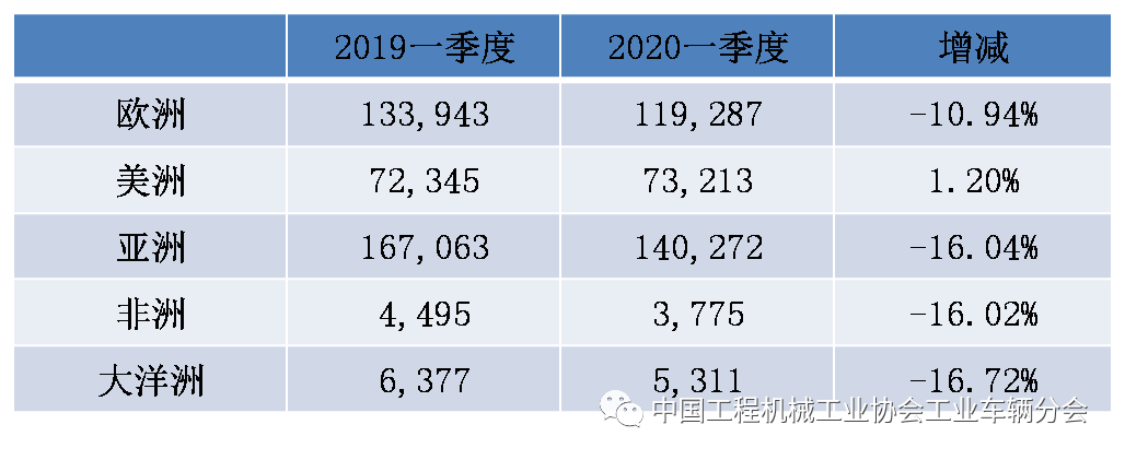 全球机动工业车辆一季度共销售341,858台,与2019年同期的384,223台相比,下跌11.03%。世界各大洲今年和去年同销售期数据比较见下表: