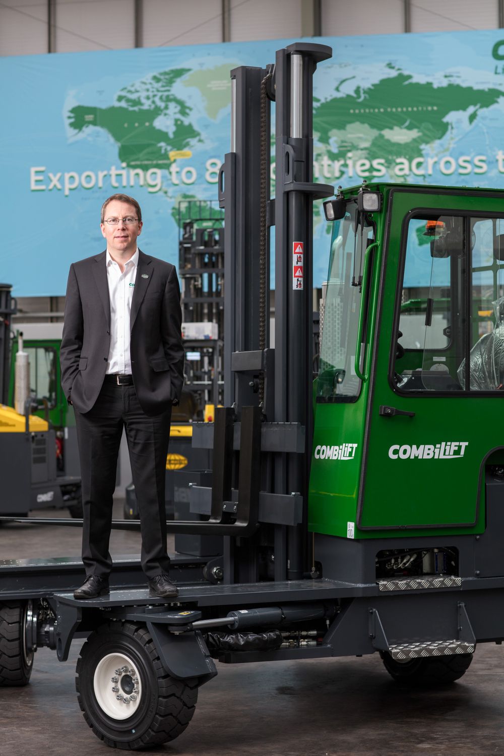 Combilift Ltd.首席执行官Martin McVicar于2018年在公司位于爱尔兰莫纳汉的工厂合影留念。Combilift通常每年在爱尔兰生产约6000辆叉车供出口。