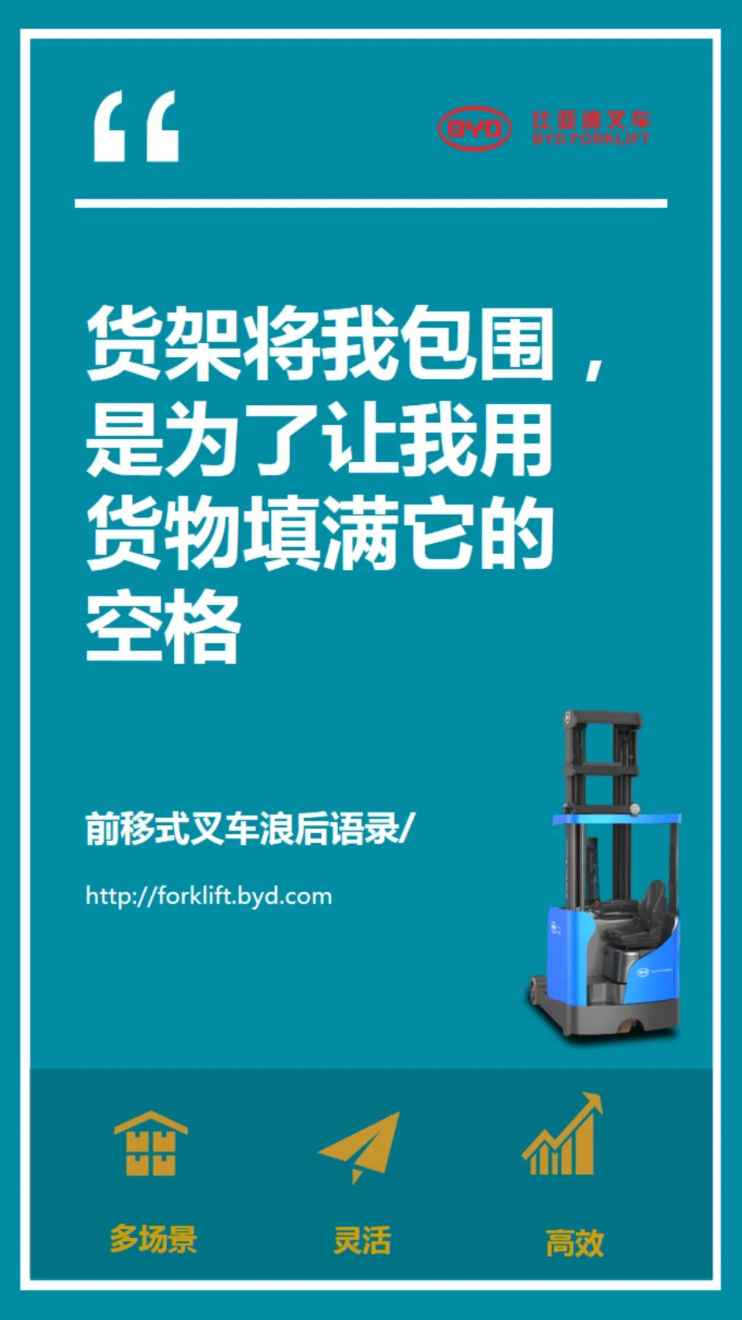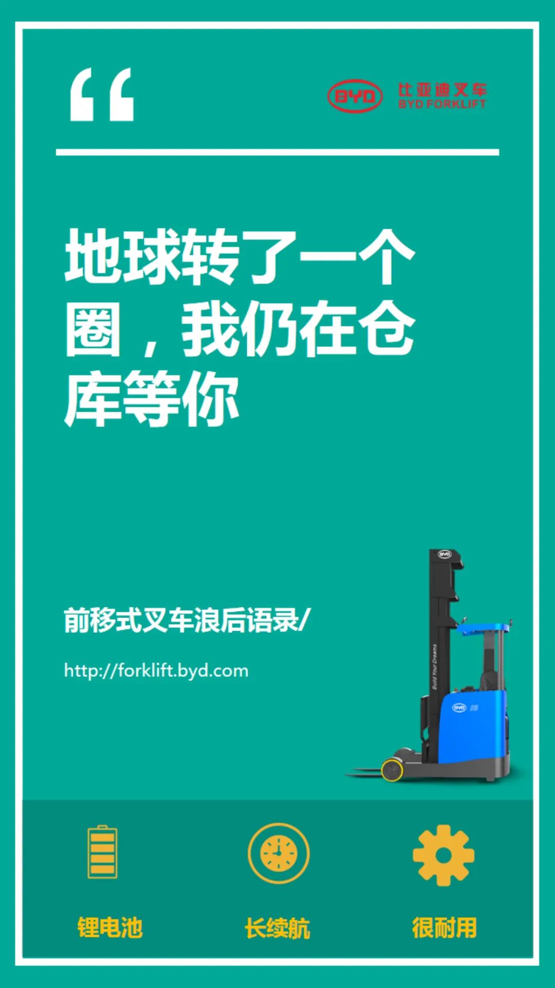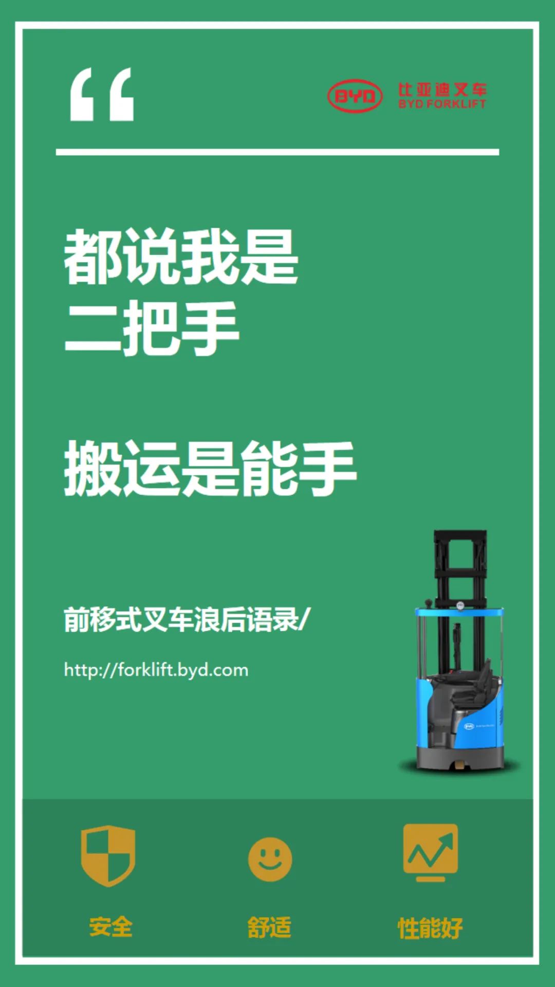 【服务宗旨】比亚迪叉车可按照不同客户的特殊需求设计符合客户要求的产品,产品设计灵活、多样。为了让比亚迪叉车可以更好的服务于客户,我们配备了专业的销售团队,为每一位客户提供专业的服务。“客户至上”是比亚迪叉车永久不变的服务宗旨。比亚迪遍布华北、华中、华东、华南和西部大区的售后服务网点和高素质的服务工程师队伍,保证了快速、高效的售后服务。