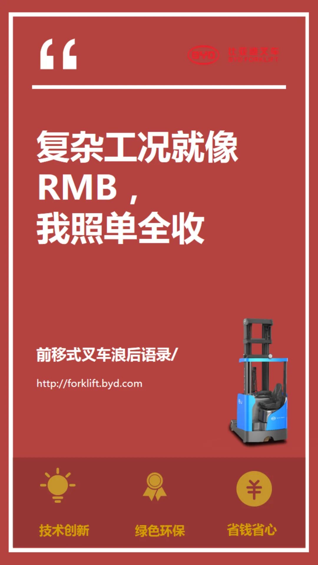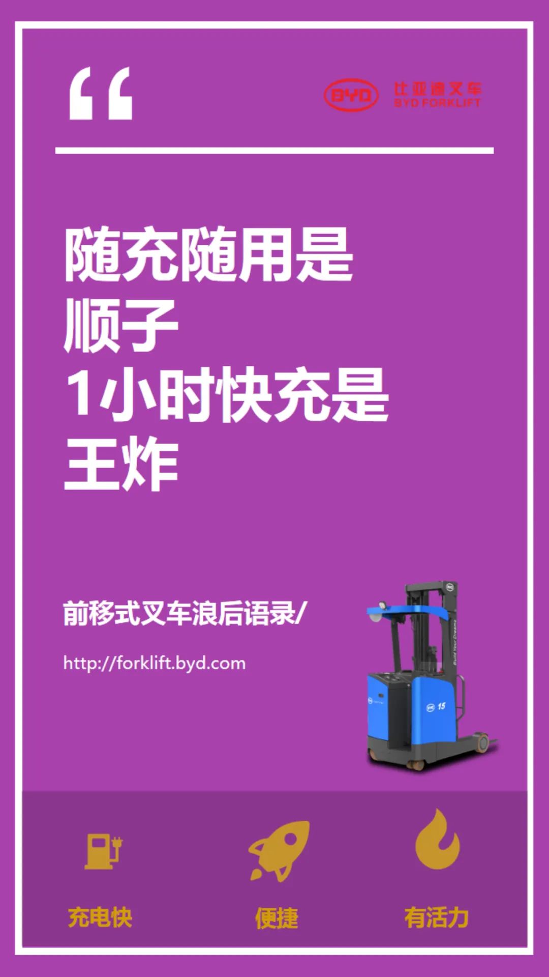 【研发实力】 比亚迪始终坚持“技术为王,创新为本”的理念,在电动叉车研发上投入技术研发人员150人,其中专项研究电器和液压的博士2名,硕士32名,国家211重点本科院校毕业生97名。具备同时研发平衡重式、托盘式、前移式、堆垛式四大系列纯电动叉车的能力。