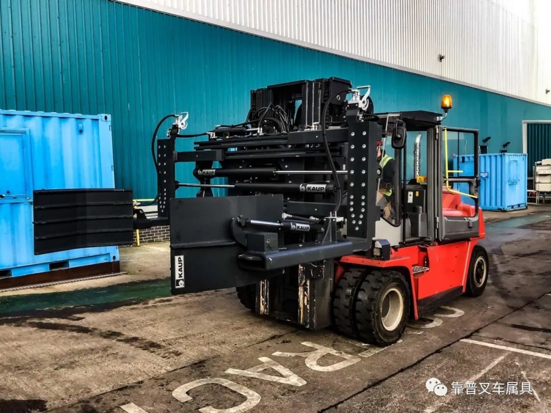 KAUP可提供载荷量1000-40000kg液压控制的叉车属具,所有产品均经过DIN EN ISO 3834-2:2006-03和ISO 9001:2015认证。