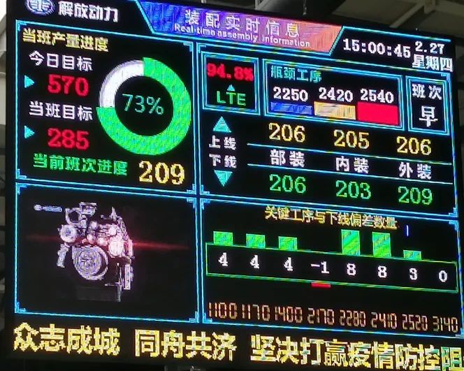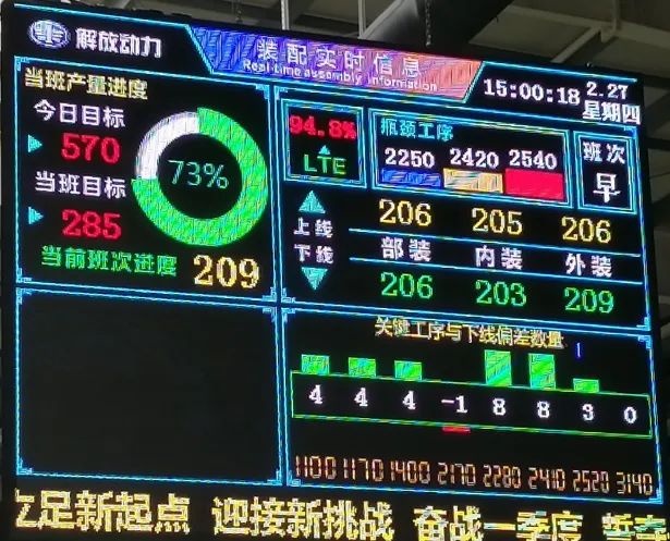 为能够实时准确展示生产线的LTE,及时掌握生产动态信息,班组自主开发《装配实时监控系统》,通过数据采集,每2分钟自动刷新运算实时的LTE、下线数量等数据,通过信息记录关键工序与下线的偏差数量,及时处理异常问题,稳步提升LTE。