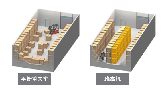 而使用堆高机,可有效减少巷道宽度