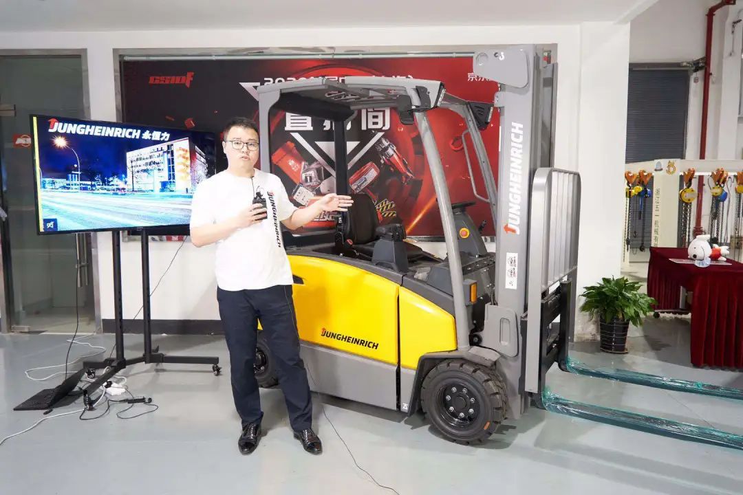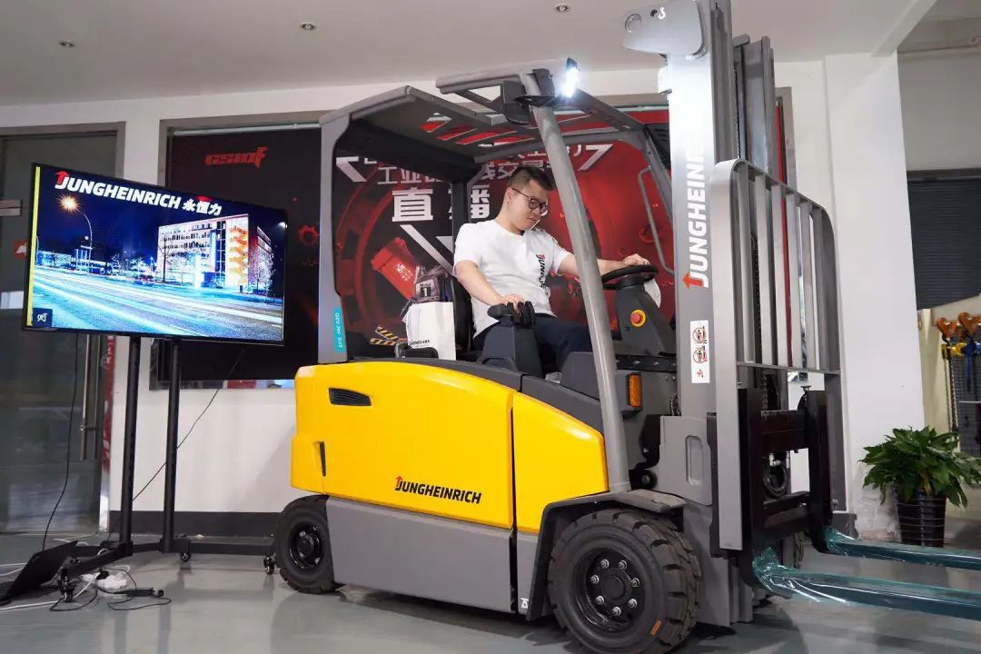 晚上19:00至19:15,永恒力的主场直播时间。现场的工作人员火速将直播的桌子撤去,换我们的永恒力叉车闪亮登场!