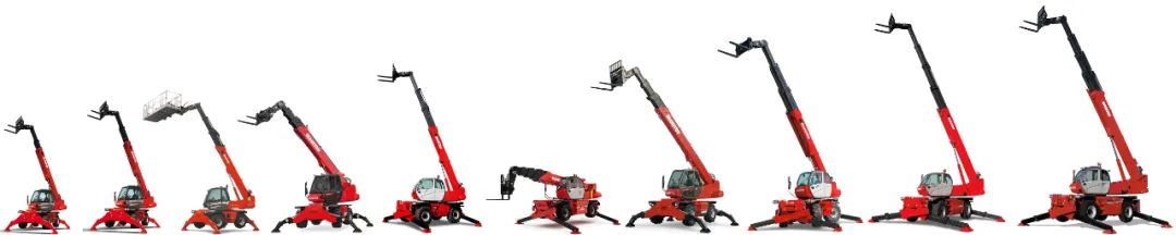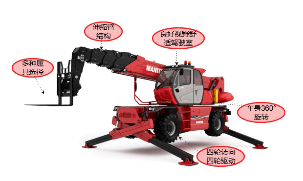曼尼通旋转型伸缩臂叉装车有举升高度从14-32米,额定载荷4-7吨十几款机型,其特点包括: