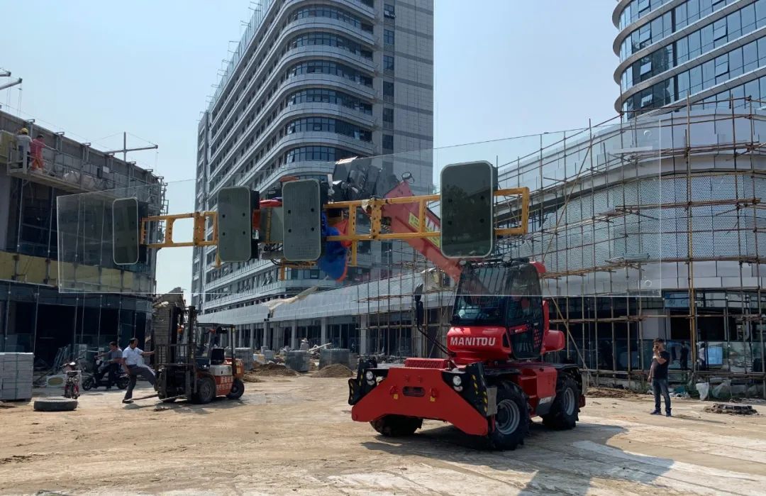 曼尼通旋转型伸缩臂叉装车+玻璃吸盘 解决方案,实现了1+1>2的效果,可以完美解决目前玻璃幕墙安装施工方面的困难。